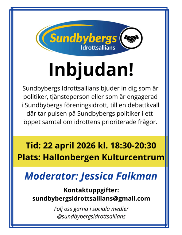 Sundbybergs Idrottsallians bjuder in till Idrottspolitisk debatt i Hallonbergens Kulturcentrum den 22 april 18:30-20:30. Sundbybergs IK kommer att vara representerade. Även du, som engagerad i Sundbybergs föreningsidrott, har möjlighet att närvara för att ta pulsen på Sundbybergs politiker i ett öppet samtal om idrottens prioriterade frågor.
